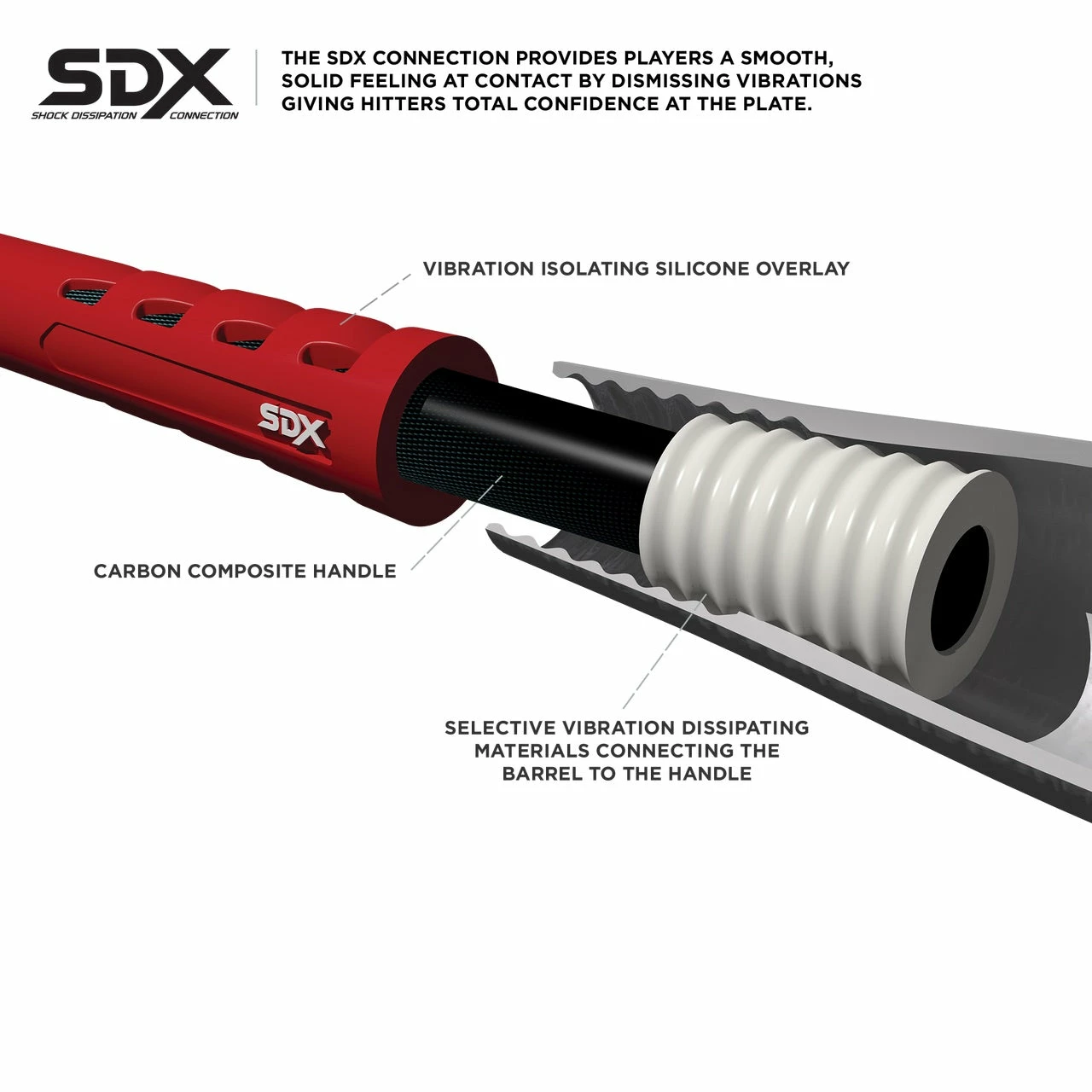 - Carbon composite handle and MDX composite barrel connect by SDX EXT to dismiss harsh, unwanted vibrations from players’ hands